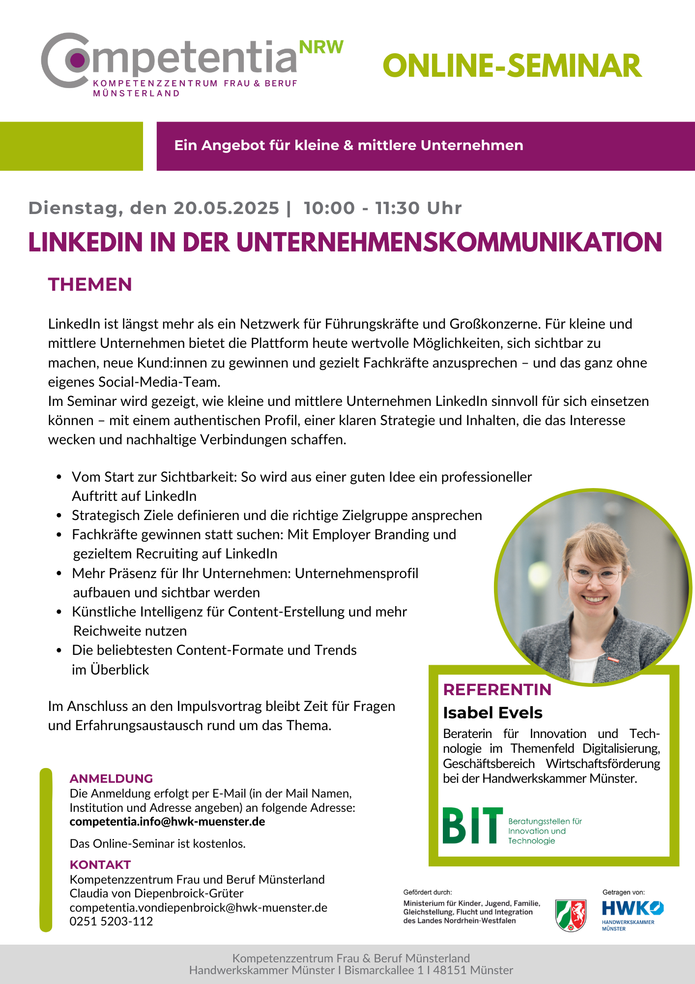 Im Seminar wird gezeigt, wie kleine und mittlere Unternehmen LinkedIn sinnvoll für sich einsetzen können – mit einem authentischen Profil, einer klaren Strategie und Inhalten, die das Interesse wecken und nachhaltige Verbindungen schaffen. Weitere Informationen entnehmen Sie bitte dem beigefügten Flyer.